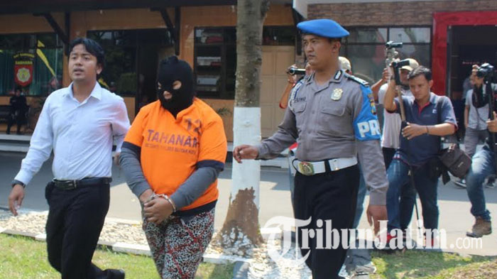 TRIBUNJATIM.COM, BLITAR - Memakai seragam tahanan dan penutup kepala, Anita (36) hanya menunduk saat aparat Satreskrim Polres Blitar Kota menggiringnya keluar dari ruang pemeriksaan, Rabu (7/6/2017). Borgol terlihat masih mengikat kedua tangan perempuan berbadan subur itu.