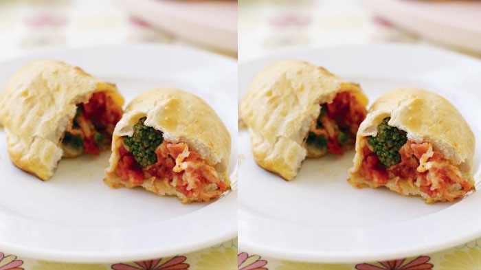 3. Ratakan setiap adonan kulit pizza dengan ukuran 3 inci, dan masukan campuran brokoli. Lipat adonan kulit pizza di atas campuran brokoli. Tekan tepi dengan garpu untuk menutup.