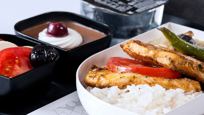 Menu di maskapai ini meliputi shish kebab, karniyarik, manti, dan imambayild.