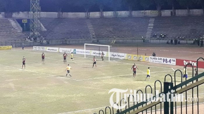 Bola yang meluncur deras ke arah gawang Persegres tak mampu dihalau oleh kiper, bola pun masuk ke dalam gawang.
