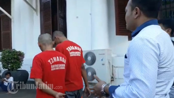 Dua orang berkepala botak yang sudah mengenakan kostum tersangka tampak digiring menuju lokasi rilis Polrestabes Surabaya.