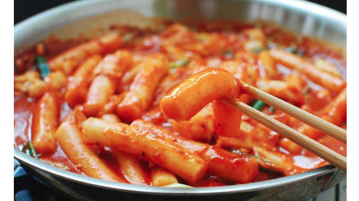 Jajanan ini disajikan dengan saus merah terang yang disebut gochujang.
