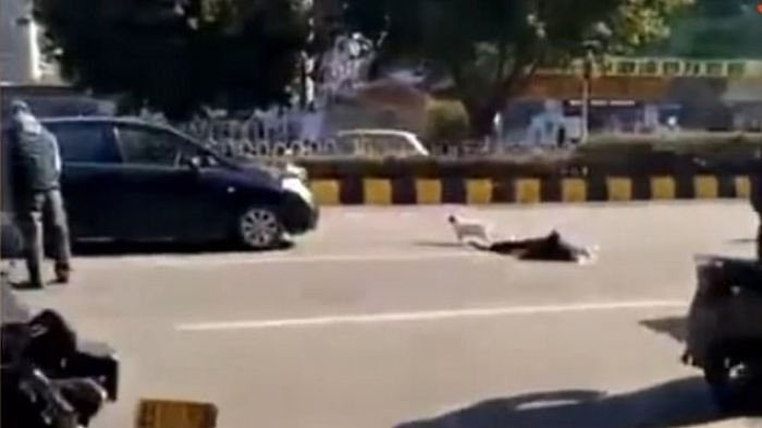 Rekaman yang diambil dengan ponsel itu memperlihatkan seorang pria tua terbaring di tengah jalan dan didampingi anjingnya.
