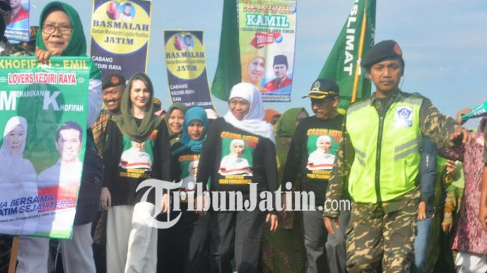 Khofifah diundang untuk memberangkatkan jalan sehat bersama Arumi ikut turun berjalan sehat bersama ribuan warga Kediri.
