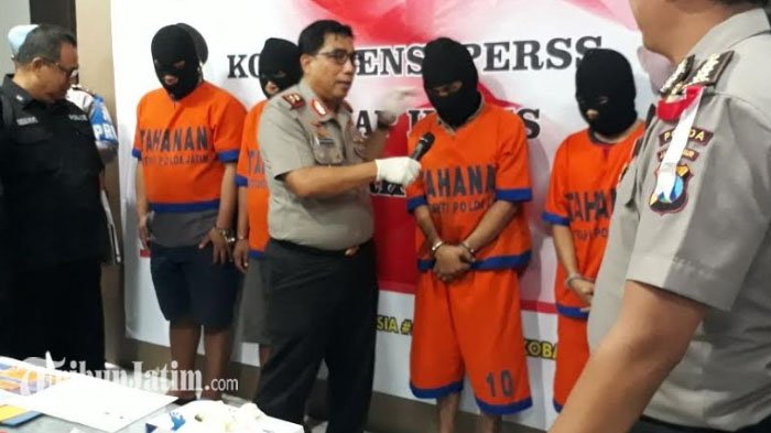 Dua tersangka yang dihadirkan kali ini bernama Budi Hartono (40) dan Tesar (27) dan ditangkap di pintu masuk Terminal Purabaya Bungurasih pada Senin (9/4/2018).