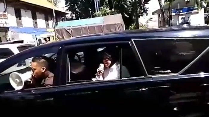 Dalam video, terlihat Risma memberikan imbauan kepada masyarakat di dalam mobil.