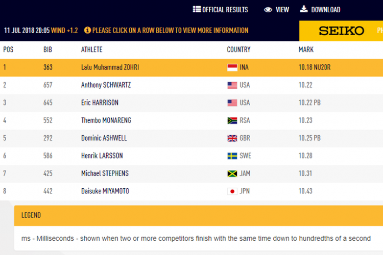 Berada di lintasan nomor 8, Lalu Muhammad Zohri berhasil menyelesaikan jarak 100 meter dengan catatan waktu 10,18 detik.