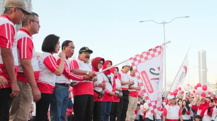 TRIBUNJATIM.COM, SURABAYA - Gubernur Jawa Timur, Soekarwo menghadiri peringatan jalan sehat dalam rangka ulang tahun Bank Jatim ke-57 tahun di Lapangan Lenmarc, Surabaya, Sabtu (18/8/2018).