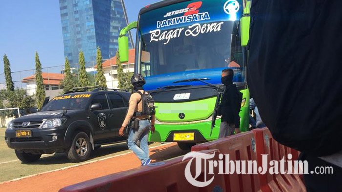 Saat dipindahkan, ke 23 tersangka kasus terorisme diboyong dari Polda Jatim menuju Bandara Internasional Juanda menggunakan dua bus besar.
