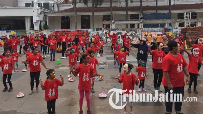 TRIBUNJATIM.COM, SURABAYA - 180 anak tampak antusias menarikan Tari Topeng Muludan, yang jadi budaya lokal masyarakat Surabaya untuk merayakan Maulid Nabi, di halaman Balai Pemuda Surabaya, Minggu (25/11/2018).