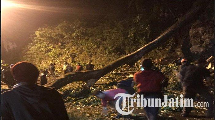 TRIBUNJATIM.COM, PASURUAN - Jalur wisata menuju kawasan Tretes, Kecamatan Prigen, Kabupaten Pasuruan sempat tertutup pohon besar dan material longsor tanah, Jumat (28/12/2018) dini hari.