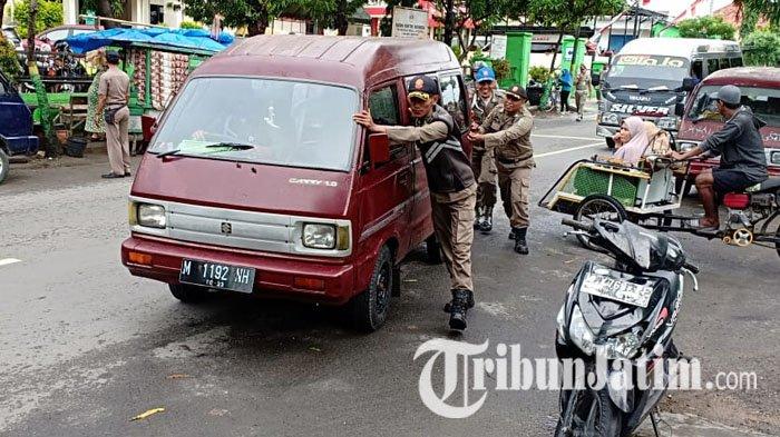 TRIBUNJATIM.COM, SAMPANG - Satpol PP Kabupaten Sampang menertibkan kendaraan yang parkir di pinggir jalan depan RSUD Mohammad Zyn, Jalan Rajawali Sampang, Sabtu (19/1/2019).