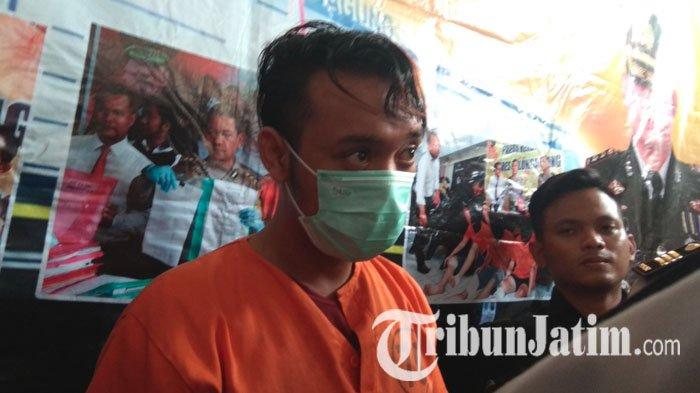 TRIBUNJATIM.COM, TULUNGAGUNG - Eko Tri Cahyono (19) berusaha menutupi wajahnya saat rilis kasus di Polres Tulungagung.