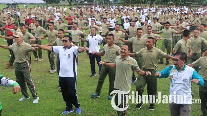Ratusan personel TNI dan Polri menggelar senam dan olahraga jalan sehat bersama di Lapangan Brigif 16 Wira Yudha Kota Kediri.