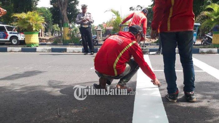 TRIBUNJATIM.COM, PAMEKASAN - Satlantas Polres Pamekasan bersama Dinas Perhubungan membuat Pita Penggaduh di Jl. Kabupaten tepatnya di depan Pendopo Ronggosukowati Pamekasan, Kamis (14/02/2019).