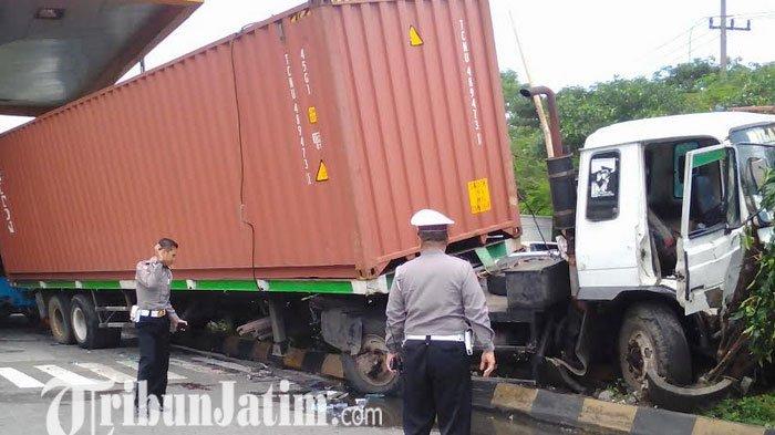 Truk kontainer bermuatan kertas tabrak empat mobil di gerbang keluar Tol Waru Ramp (dari Sidoarjo menuju ke Jalan Ahmad Yani Surabaya), Jumat ( 01/03
