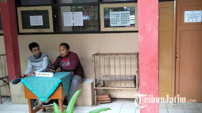 TRIBUNJATIM.COM, BANGKALAN - Dua anggota Satreskoba Polres Bangkalan berpakaian kasual duduk di depan Ruang Laboratorium II SMKN 1 Bangkalan, Rabu (27/3/2019).