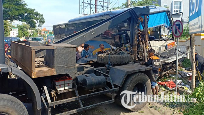 Sementara bus mengalami kerusakan parah pada bagian depan.