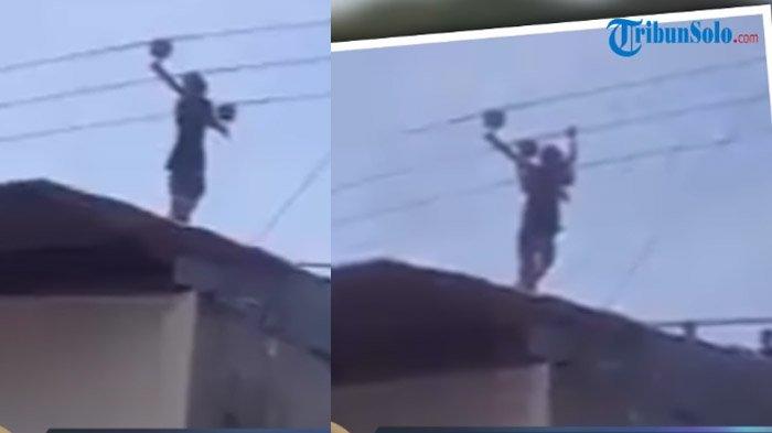 Tampak pula sejumlah warga yang sudah naik ke atap untuk mencoba menghentikan aksi bocah lelaki tersebut.