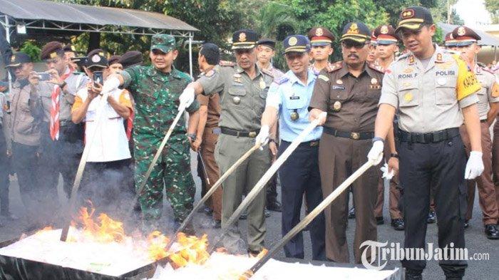 Pemusnahan dilakukan dengan cara menggilas ribuan botol miras dengan sepur tumbuk. Sedangkan barang bukti narkoba dimusnahkan dengan cara dibakar di dalam tong.