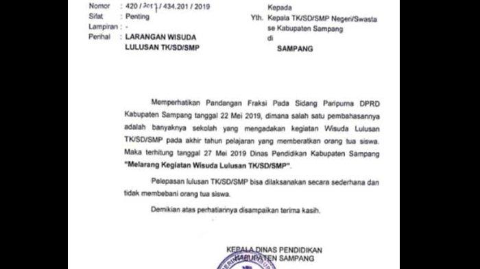 Dalam surat yang bernomor 420/2057/434.201/2019 berisi tentang larangan kegiatan wisuda lulusan TK/SD/SMP.