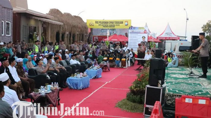 TRIBUNJATIM.COM, GRESIK - Kegiatan yang menarik di miniatur rumah adat dan Tugu Pahlawan di pos pelayanan mudik 2019 Polres Gresik, tempatnya di SPBU Desa Tebaloan Kecamatan Duduksampeyan. Kegiatan itu berupa santunan kepada anak-anak yatim piatu dan dhuafa serta buka puasa bersama.
