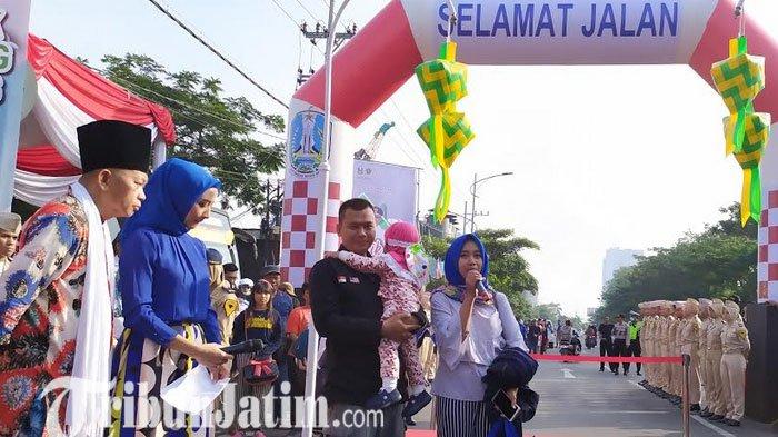 TRIBUNJATIM.COM, SURABAYA - Rouf dan keluarga tak kuasa menahan haru saat mengucapkan terima kasih pada Gubernur Jawa Timur Khofifah Indar Parawansa dalam pemberangkatan Mudik Bareng Gratis untuk moda transportasi bus, Minggu (2/6/2019).