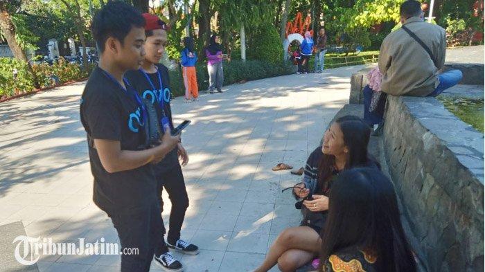Dari pantauan TribunJatim.com di lapangan, beberapa tim berseragam OVO mendatangi orang-orang yang berkunjung di Taman Bungkul Surabaya.