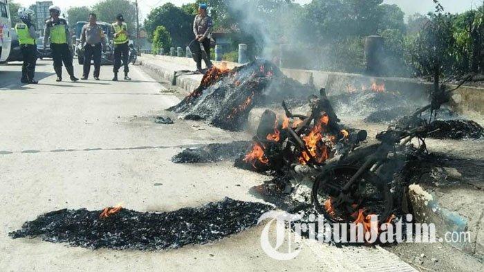 TRIBUNJATIM.COM, JOMBANG - Sebuah sepeda motor yang mengangkut ban bekas terbakar di Jalan Raya Desa Keplaksari, Kecamatan Peterongan, Jombang, Minggu (14/7/2019).