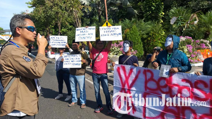 TRIBUNJATIM.COM, SURABAYA - Sejumlah wartawan yang tergabung dalam Aliansi Jurnalis Indonesia (AJI) dan Perhimpunan Pers Mahasiswa Indonesia (PPMI) menggelar unjuk rasa di depan Gedung Negara Grahadi, Jalan Gubernur Suryo, Surabaya, Sabtu (28/9/2019).
