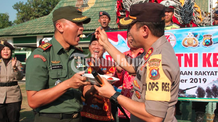HUT TNI ke 74, Kapolres Bojonegoro ARak Nasi Tumpeng dan Suapi Dandim