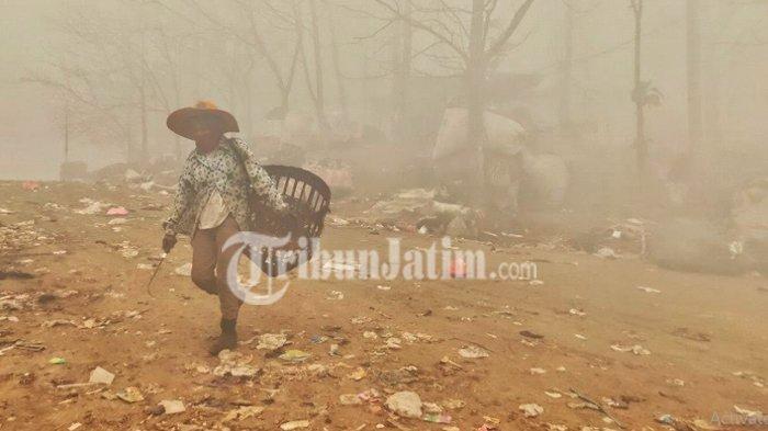 TRIBUNJATIM.COM, KLOJEN - Demi sesuap nasi, Warti tetap mengais barang bekas yang masih bernilai di tengah kepulan asap kebakaran TPA Supit Urang, Sukun, Kota Malang.