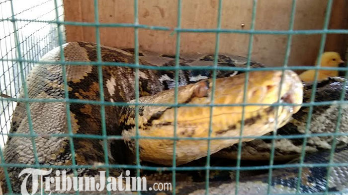 Saat ini ular tersebut diamankan oleh warga setempat dengan cara mengurungnya di dalam bekas kandang Burung Dara yang terbuat dari lapisan papan kayu dan teralis besi.