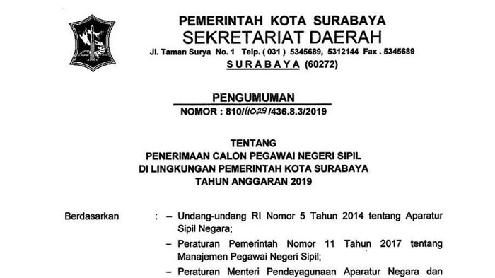Berikut lonk download surat lamaran CPNS 2019 Pemkot Surabaya, syarat wajib saat mendaftar CPNS 2019.