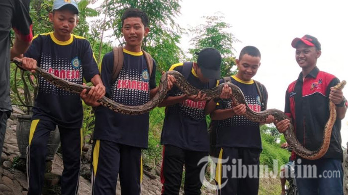 Ular Piton Sepanjang 4 Meter Masuk Kolam Budidaya Ikan Gegerkan Warga Lengkong Mojokerto
