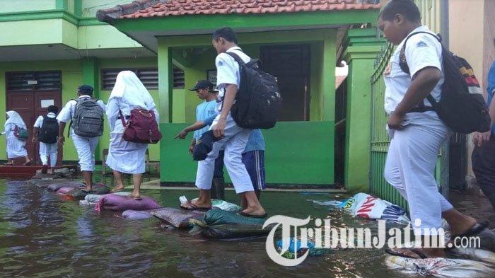 TRIBUNJATIM.COM, SIDOARJO - Banjir yang menggenangi kompleks SMPN 2 Tanggulangin Sidoarjo tak menyurutkan semangat siswa di sana untuk tetap belajar.