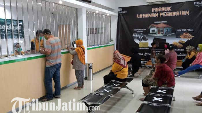 TRIBUNJATIM.COM, TULUNGAGUNG - Kantor Pegadaian Cabang Tulungagung, Jawa Timur dibanjiri warga yang ingin menggadaikan barang untuk kebutuhan sehari hari dampak dari penyebaranvirus Corona atau Covid-19.