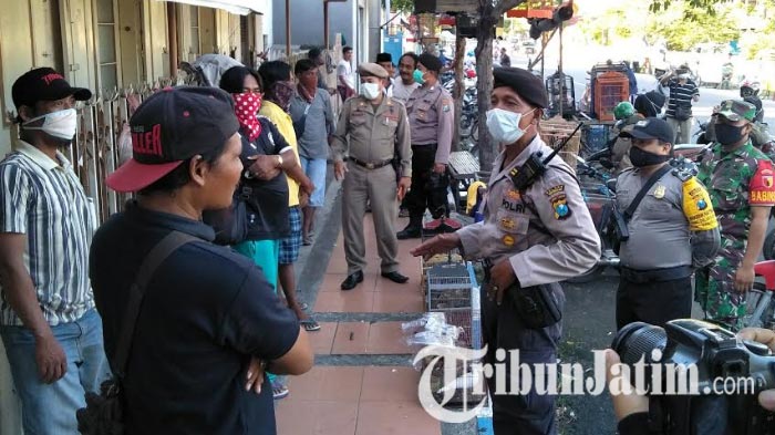TRIBUNJATIM.COM, BANGKALAN - Pasar sore khusus jual beli beragam jenis burung di Jalan Panglima Sudirman, Kampung Jagalan Kelurahan Bancaran, Bangkalan menjadi sasaran tindakan preventif personel gabungan di tengah pandemi virus Corona atau Covid-19, Senin (14/4/2020).