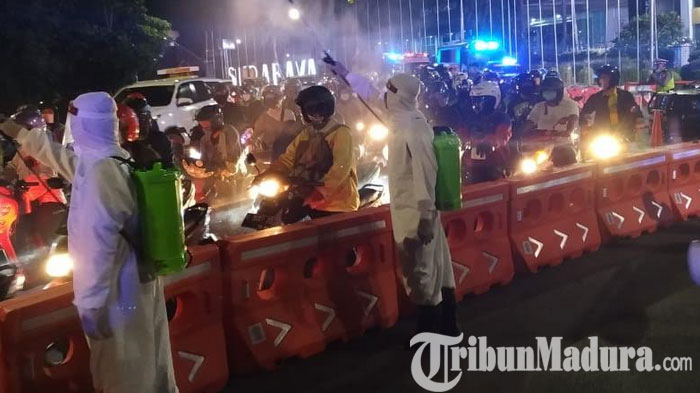 Anggota tim juga melakukan penyemprotan cairan disinfektan di sejumlah ruas jalan Kota Surabaya, satu diantaranya di ruas jalan kawasan Bundaran Waru atau di Pos Check Point Bundaran Waru, Gayungan, Surabaya.