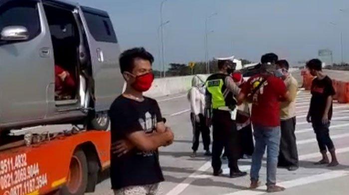 TRIBUNJATIM.COM, SURABAYA - Anggota Satuan PJR Ditlantas Polda Jatim mengamankan sebuah truk towing yang mengangkut sebuah mobil jenis SUV berwarna silver, di Interchange Chevron Tol Ngawi, Kamis (14/5/2020).