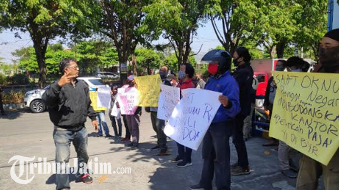 TRIBUNJATIM.COM, SURABAYA -Sejumlah orang membeber spanduk di depan Kantor Wilayah (Kanwil) Bea Cukai Jatim I.