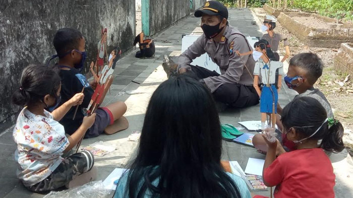 Mendongeng dengan Wayang, Kapolsek Puncu Kediri Bentuk Karakter Anak Patuhi Protokol Kesehatan