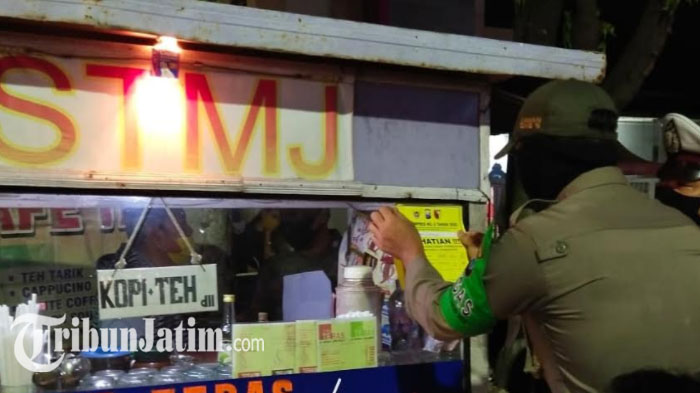 "Pengelola kafe tidak menaati protokol kesehatan dengan tidak menjaga jarak. Petugas telah menempelkan Tanda Perhatian dan memberikan peringatan pertama," jelasnya. (TRIBUNJATIM/Didik Mashudi)