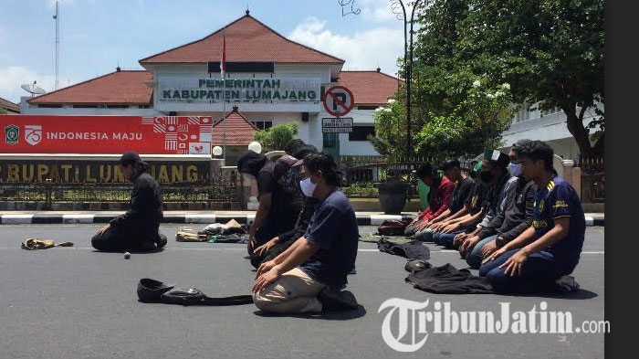 TRIBUNJATIM.COM, LUMAJANG - Sejumlah massa yang menggelar aksi demonstrasi di depan kantor Bupati Lumajang kecewa lantaran gagal bertemu Bupati Lumajang, Thoriqul Haq, Senin (14/9/2020).