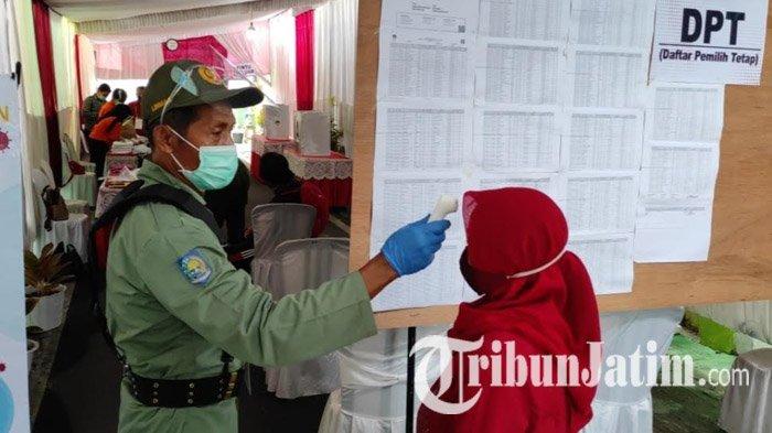 Para calon pemilih juga dicek suhu tubuh sebelum masuk ke TPS. Posisi tempat duduk di TPS juga diatur dengan menjaga jarak.
