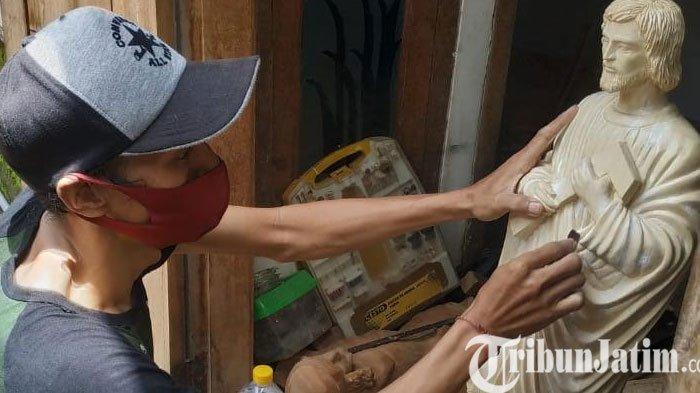 TRIBUNJATIM.COM, KEDIRI - Yusuf Sujoko Pengerajin patung rohani di Pohsarang Kediri mendapatkan banyak orderan menjelang perayaan hari raya Natal 25 Desember 2020.