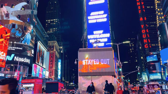 Melalui akun instagram dengan mengunggah Video iklan yang terpampang di Times Square tersebut beserta captionnya.