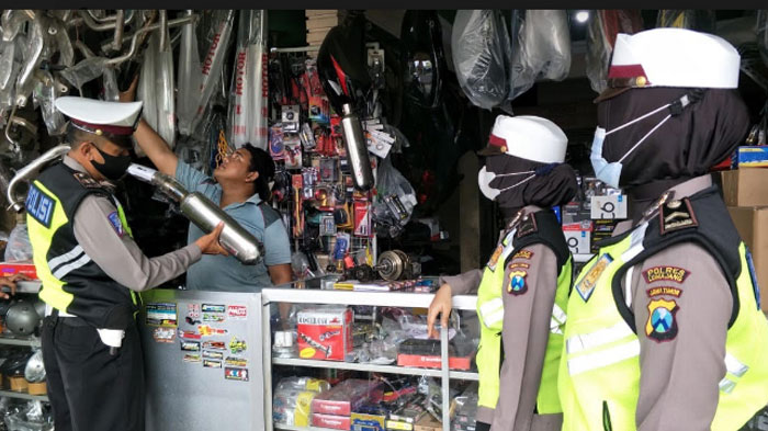 Polres Lumajang melakukan operasi knalpot brong jelang pergantian Tahun Baru 2021. Imbau pedagang tak menjual atau layani pemasangan knalpot brong.
