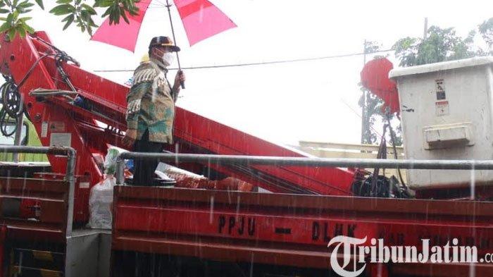 Meski hujan deras mengguyur, Hudiyono tetap melanjutkan aktivitasnya. Bersama petugas DLHK Sidoarjo, dia menyisir dan memeriksa satu persatu lampu yang ada di sepanjang jalan itu.
