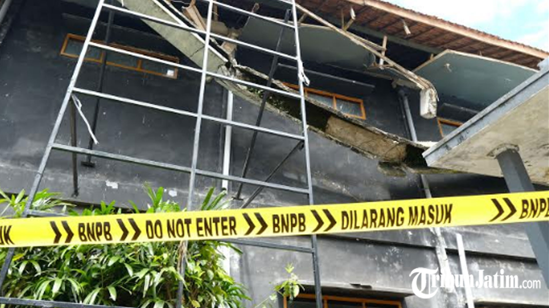 Atap beton Gedung Kesenian Batu rusak nyaris roboh. Kepala BPBD Agung Sedayu ungap area dipasang pita pembatas untuk mencegah adanya korban.